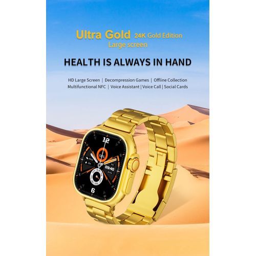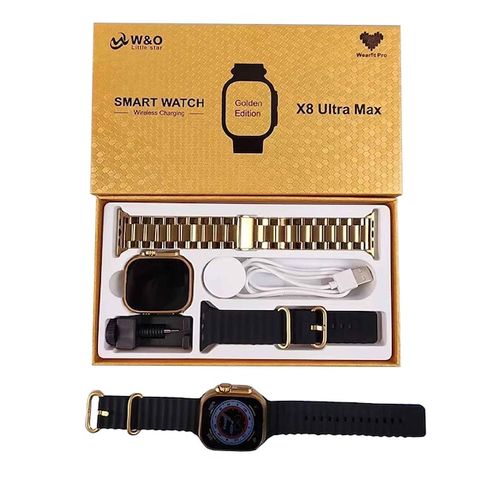 ساعة W&O X8 Ultra Max Smart Watch Gold Edition هي ساعة ذكية أنيقة وفاخرة مصممة لمن يبحثون عن مزيج من الأناقة والوظائف المتقدمة. تتميز بشاشة كبيرة بحجم 49 مم توفر ألواناً زاهية وتجربة مرئية رائعة، بالإضافة إلى تصميمها الفاخر بلون الذهب الذي يجعلها ملحقاً أنيقاً في أي مناسبة.